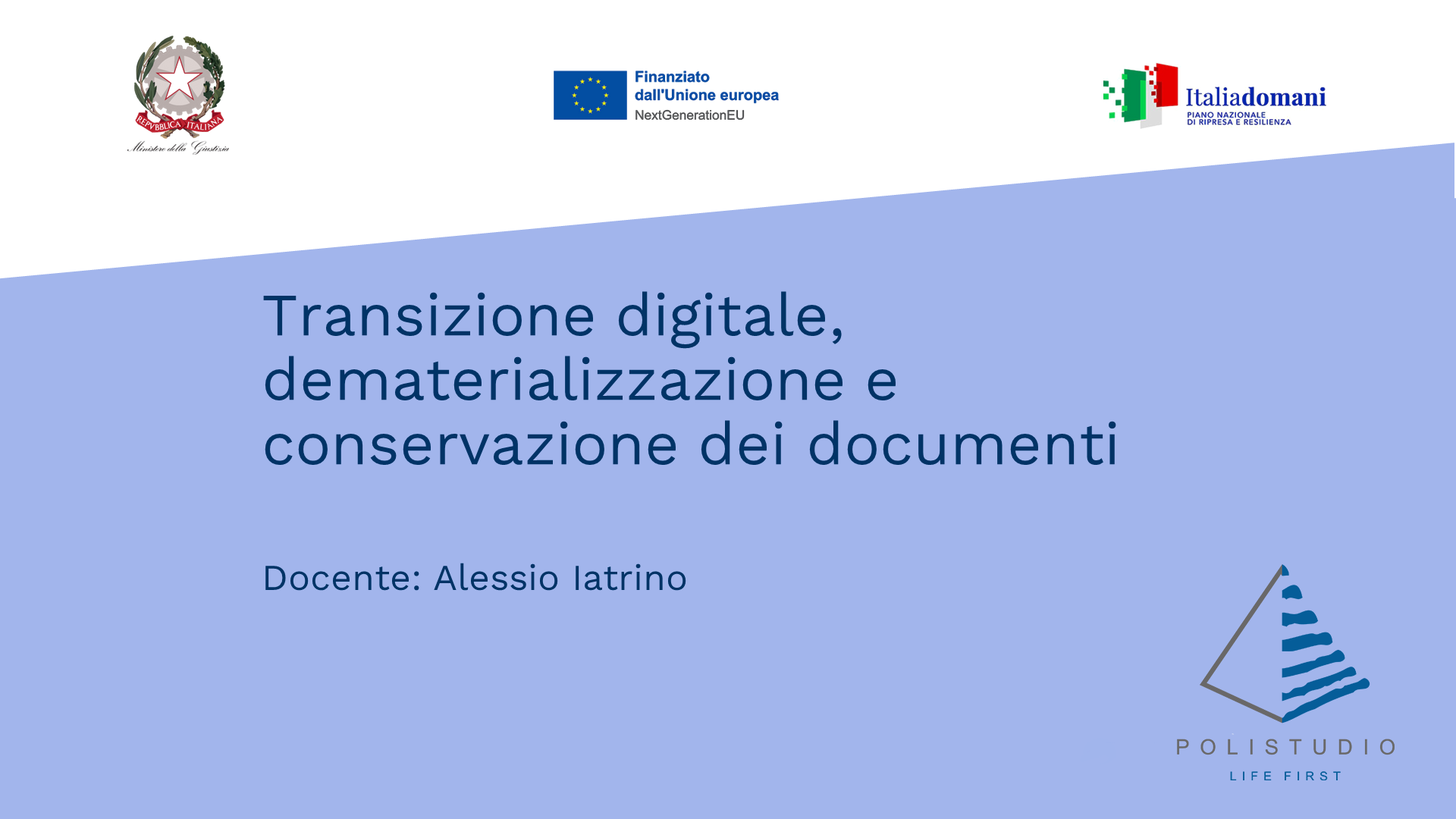 Corso di Transazione digitale, dematerializzazione e conservazione dei documenti gestito dal Prof. Alessio Iatrino.